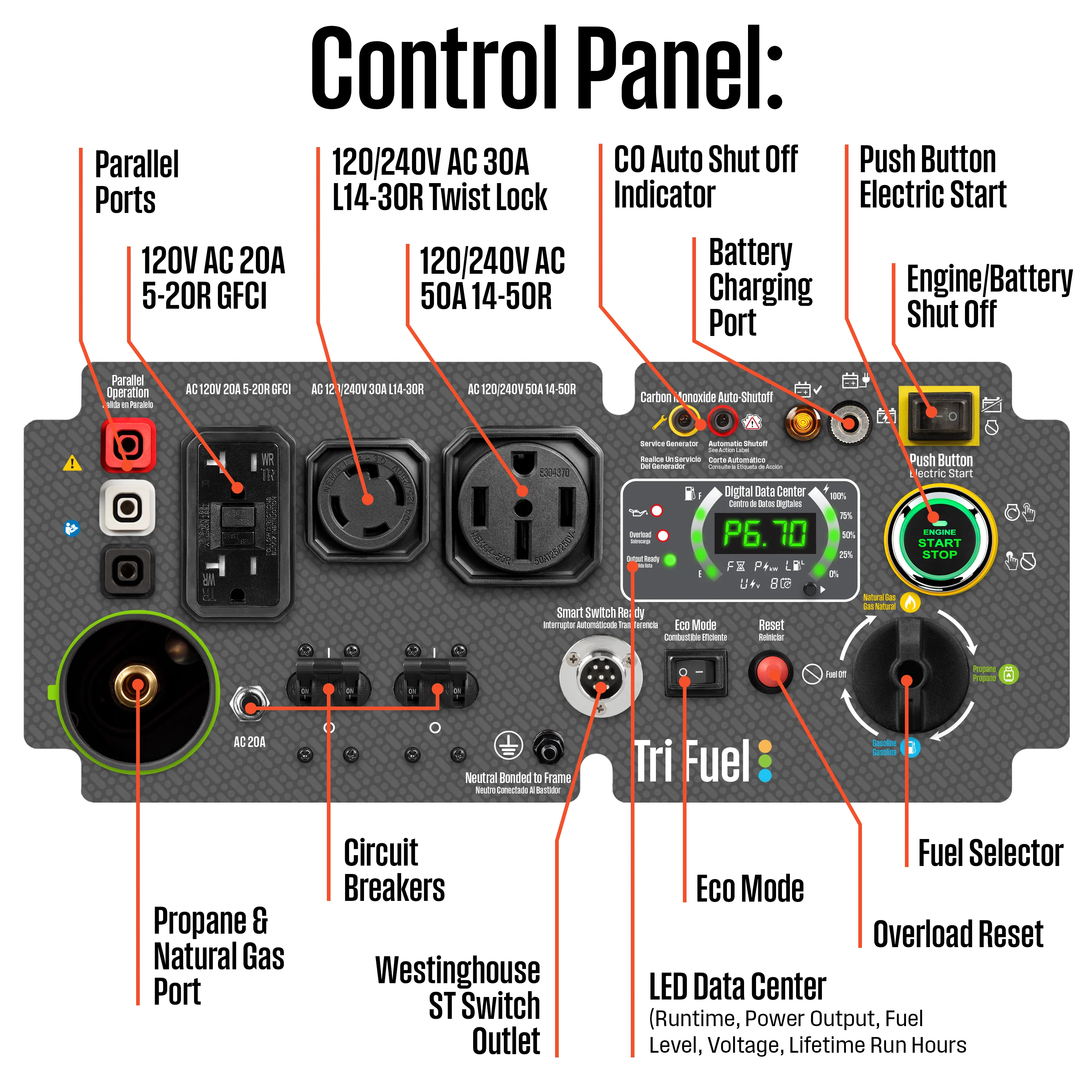 - TRANSFER SWITCH OR INTERLOCK KIT READY: Features one 120/240V 14–50R 50A outlet for home or RV and one 120V/240 L14-30R 30A twist lock, both outlets are transfer switch or interlock kit ready for home backup; includes one GFCI 120V 5–20R 20A duplex household outlet; all have rubber covers