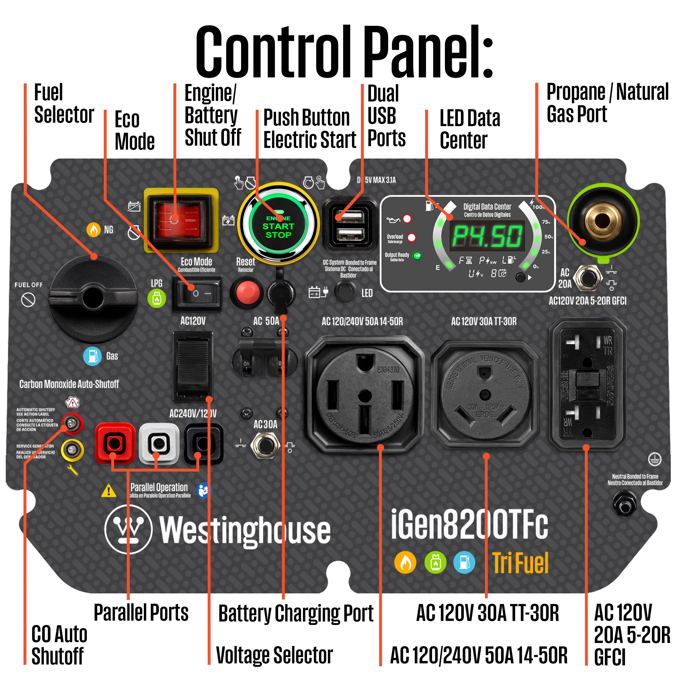 The Westinghouse iGen8200TFc portable inverter generator with CO sensor produces up to 8,200 peak watts and 6,600 running watts with less than 3% THD, making it a perfect solution for home backup, even when using sensitive electronics. Inverter technology lets you safely power items like computers, phones and TVs and is quieter and more fuel efficient than traditional generators. Copper windings help the unit make cleaner power, run cooler and last longer. A 298 cc 4-stroke OHV Westinghouse engine with a cast iron sleeve runs for up to 17 hours at 25% load on a 3.9 gallon gas tank with a digital fuel gauge, automatic low oil shutdown, and a GFCI duplex 20A outlet. Push-button electric start and remote start key fob make starting effortless, even at a distance. The control panel features a transfer switch or interlock kit ready 14-50R 50A outlet that can power major appliances like air conditioners, refrigerators, sump pumps and any lights or entertainment centers at the same time with a single cord. A TT-30R 30A RV outlet for travel trailer use is included. An LED data center shows voltage, frequency and lifetime hours to keep you up to date on real-time information and regular maintenance. Easily portable with never-flat wheels and folding handle, it'll have your house, travel trailer or jobsite powered in seconds. The iGen8200TFc comes with a 3-Year Limited Warranty and lifetime technical support backed by our nationwide Westinghouse Customer Service and Support Network.