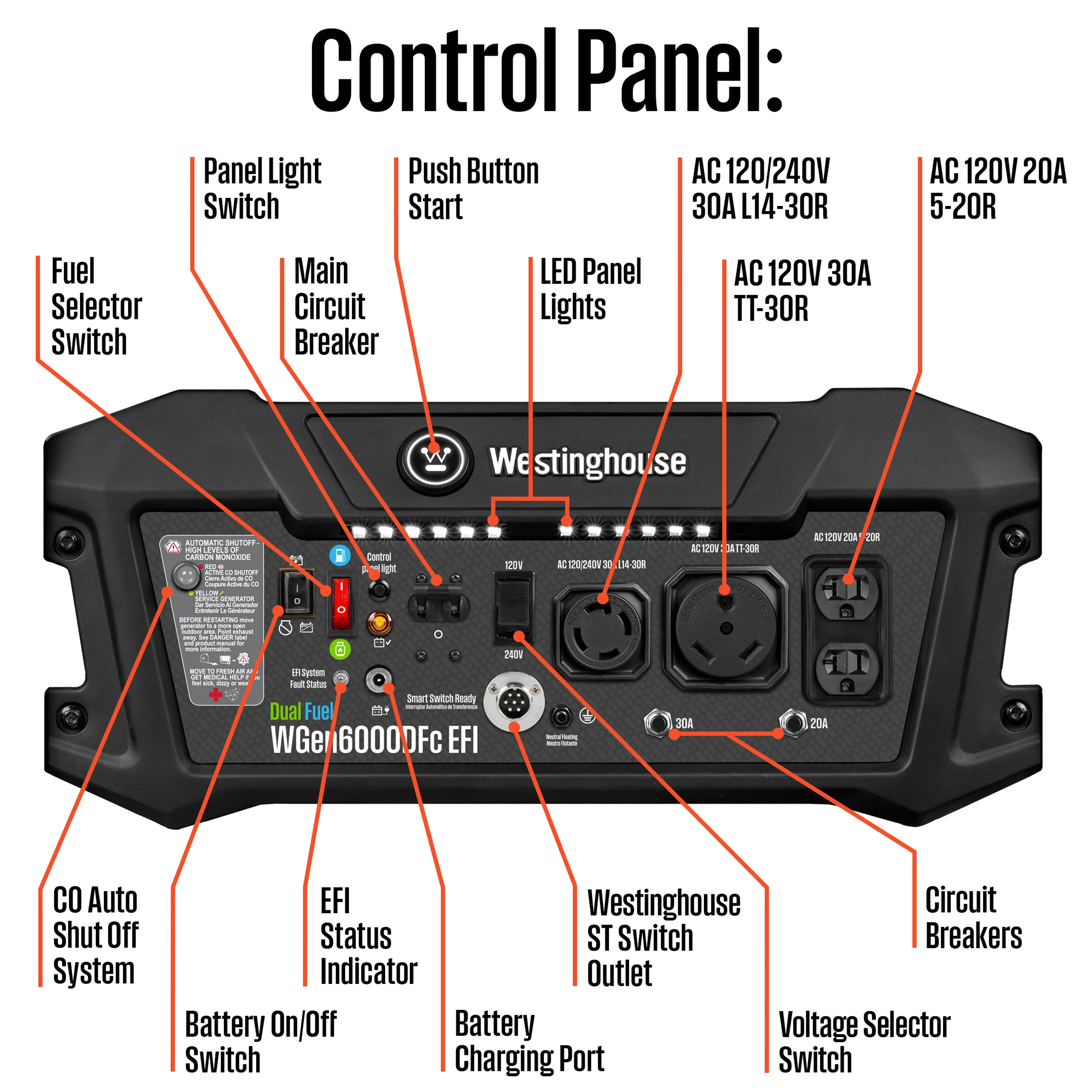 The Westinghouse WGen6000DFc EFI Dual-Fuel Portable Generator with CO Sensor produces up to 7,500 peak watts and 6,000 running watts. As a dual fuel generator, the WGen6000DFc EFI runs on gasoline or propane (LPG). The heavy duty 298cc 4-stroke OHV Westinghouse EFI Engine is constructed of a durable cast iron sleeve and runs for up to 14 hours on a 4.75 gallon (18 L) gas tank, keeping you powered through the day with built-in fuel gauge and automatic low oil shutdown. Electronic fuel injection and push-button electric start makes starting the WGen6000TFc EFI as easy as starting your car, with no carburetor or choke to hassle with. And the remote start key fob offers added ease from a distance. Its lighted control panel spotlights one transfer switch ready L14-30R 120V/240V 30A twist lock to power your major appliances like the air conditioner, refrigerator, sump pump, lights or entertainment centers with a single cord hookup; one TT-30R 120V 30A RV outlet; one 5-20R 120V 20A duplex household outlet; all outlets include rubber covers for added protection. Conveniently portable with a set of heavy duty never-flat wheels, foldable handle, it'll have your house, travel trailer or jobsite powered in seconds. The WGen6000DFc EFI is complete with a 3-Year Limited Warranty and lifetime technical support backed by our nationwide Westinghouse Customer Service and Support Network.
