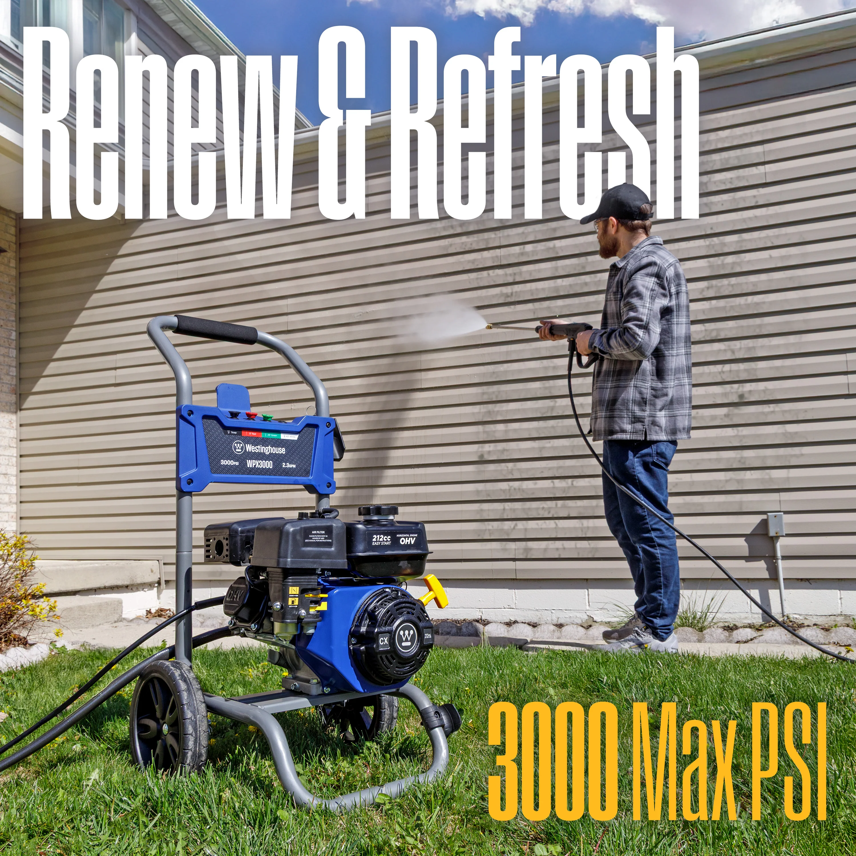 The Westinghouse WPX3000 3000 PSI 2.3 GPM gas powered pressure washer has the muscle to blast away grime from even your toughest cleaning jobs. Built from a powerful 4-cycle OHV Westinghouse engine, it’s meant for powerful heavy-duty cleaning. From a wide variety of 4 nozzle tips, you can interchange the heads to suit your specific challenge of the day. The WPX3000 is safe to use on brick, stone, concrete, wood, aluminum, and iron. With a 3.6 L fuel capacity and never-flat wheels that offer easy roll-away mobility, you can maneuver the strength of this washer to get into hard to reach corners and scale across walls. Deep cleaning projects such as decks, sidewalks, siding, fences, railings, garage floors, exterior walls, cars, and patio furniture are easier than ever before.