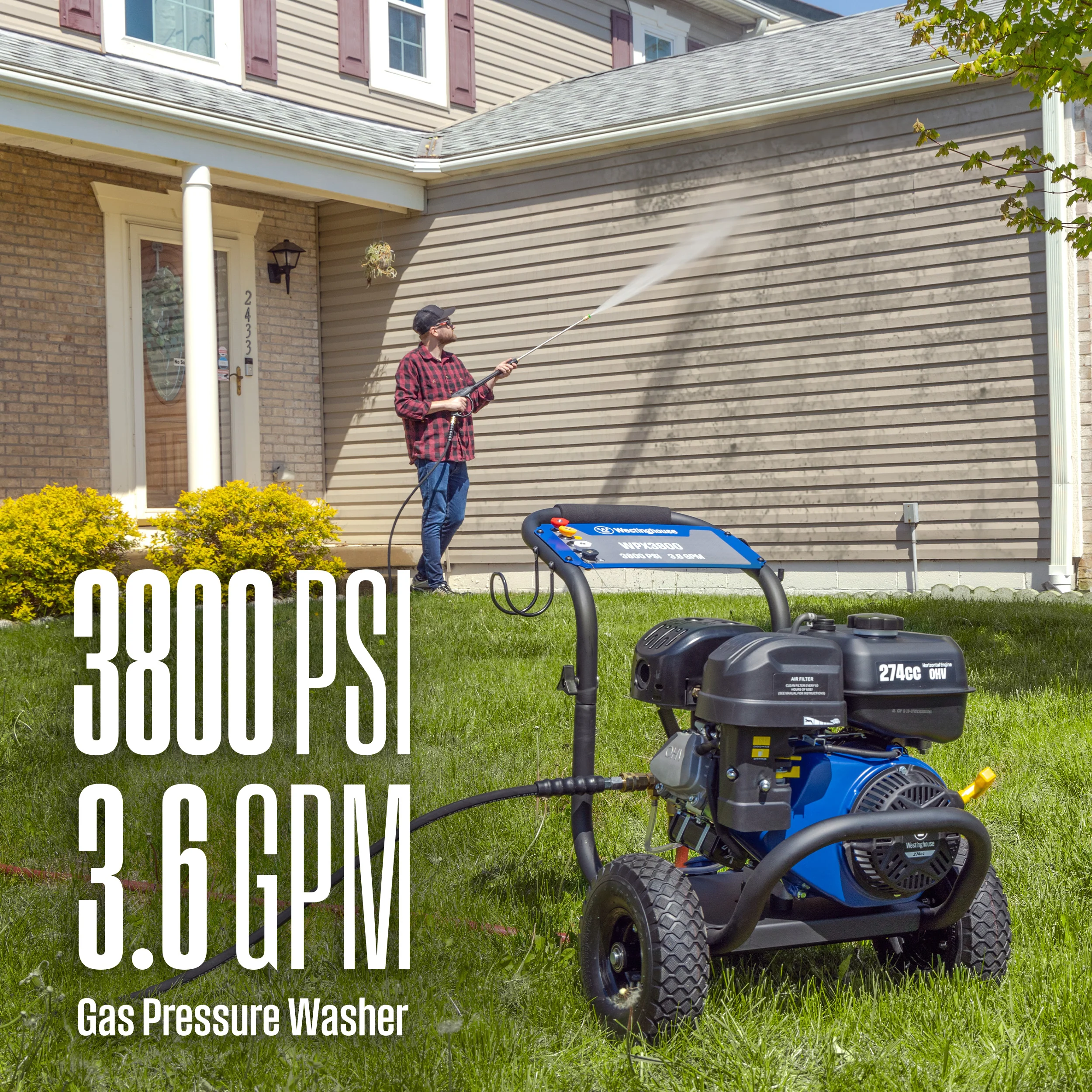 The Westinghouse WPX3800 Gas Powered Pressure Washer, with 3800 PSI and 3.6 GPM, is designed to tackle your toughest cleaning jobs with ease. Built with a powerful 4-cycle OHV Westinghouse Engine and a maintenance free triplex brass head pump, it’s meant for powerful heavy-duty cleaning. With 5 interchangeable nozzle tips and a built in 3 L soap tank, the WPX3800 has the versatility to handle a variety of situations and surfaces including brick, stone, concrete, wood, aluminum, and iron. The 5 L fuel tank and never-flat wheels offer easy mobility and maneuverability, allowing you to get into those hard-to-reach places with the toughest grime. Make all your deep-cleaning projects easier than ever before with the Westinghouse WPX3800 Pressure Washer.